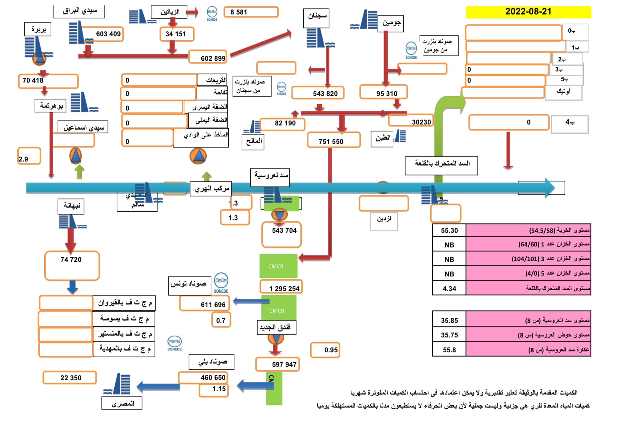 بالنسبة لماء السبالة "الصالح للشراب"، الحكاية موش الماء مش يقص في الليل فقط. في العادة (السنة الماضية)، كل يوم شبكة المياه متاع Sonede تستهلك 0.75 مليون متر مكعب من منظومة سدود البراق/سجنان (يمكن الرجوع لمنشور شهر جانفي)، و 0.35 مليون من شبكة سد سيدي سالم، باقي مياه سد سيدي سالم تذهب للوطن القبلي و الساحل للري للفلاحة. في الأيام الأخيرة، وقع إيقاف التزود بالمياه من سد سيدي سالم نظرا أن منسوب المياه فيه لا يفوق 16%، يعني شبه فارغ، و وقع الترفيع في التزود من منظومة البراق/سجنان إلى 0.85 مليون متر مكعب يوميا. يعني في الإجمال وقع تخفيض المياه الموزعة عبر شبكة ال Sonede من سدود الشمال ب 0.25 مليون متر مكعب (-20%)، بالنسبة للمدن الكبرى اللي تستهلك أساسا مياه السدود، هناك عديد المناطق يقع تزويدها بمياه آبار عميقة و سيكون تزويد المياه فيها أقل اضطراب. صوناد تونس كانت تستهلك 0.6 مليون متر مكعب يوميا، يقع حاليا تزويدها ب 0.45 مليون متر مكعب، و بقية مدن الساحل و الوطن القبلي و صفاقس ، وقع التخفيض من 0.45 إلى 0.35 مليون متر مكعب.