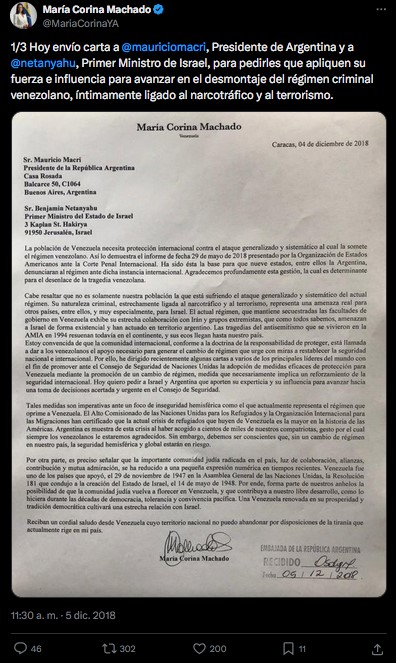 En 2018, Machado a adressé une lettre au Premier ministre israélien Benjamin Netanyahu et au président argentin Mauricio Macri, leur demandant d'« appliquer leur force et leur influence pour démanteler le régime criminel vénézuélien », lié – selon ses propres mots – au « trafic de drogue et au terrorisme ». Elle a explicitement invoqué la doctrine de la « responsabilité de protéger » (R2P), un outil impérialiste utilisé dans le passé pour justifier des interventions militaires en Libye, en Irak et ailleurs. Traduit :elle a appelé à une intervention armée étrangère contre le Venezuela.