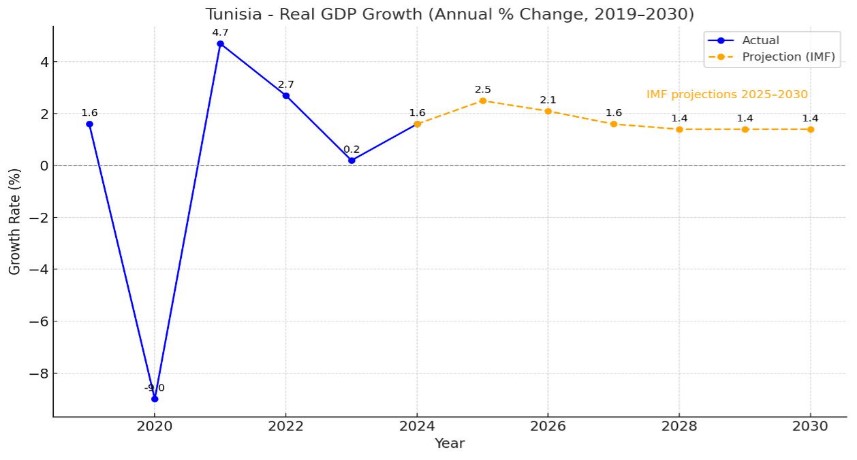 Les dernières prévisions du FMI pour la Tunisie sont éloquentes : au cours des cinq prochaines années, la croissance devrait ralentir progressivement pour se stabiliser autour d’un modeste 1,4 %.