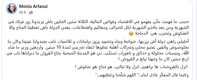 C’est bien illustré par ce statut Facebook de Monia Arfaoui :