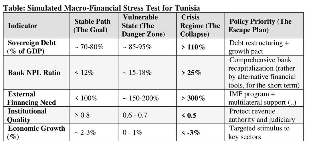 (2) L'état vulnérable (Zone de danger) : L'économie est fragile. Elle est stable pour l'instant, mais seulement par conjoncture favorable. Un seul choc négatif (comme l'échec des négociations avec le FMI ou une nouvelle flambée des prix alimentaires) peut déclencher une spirale descendante rapide et auto-entretenue. C'est dans cette situation que se trouve la Tunisie aujourd'hui.