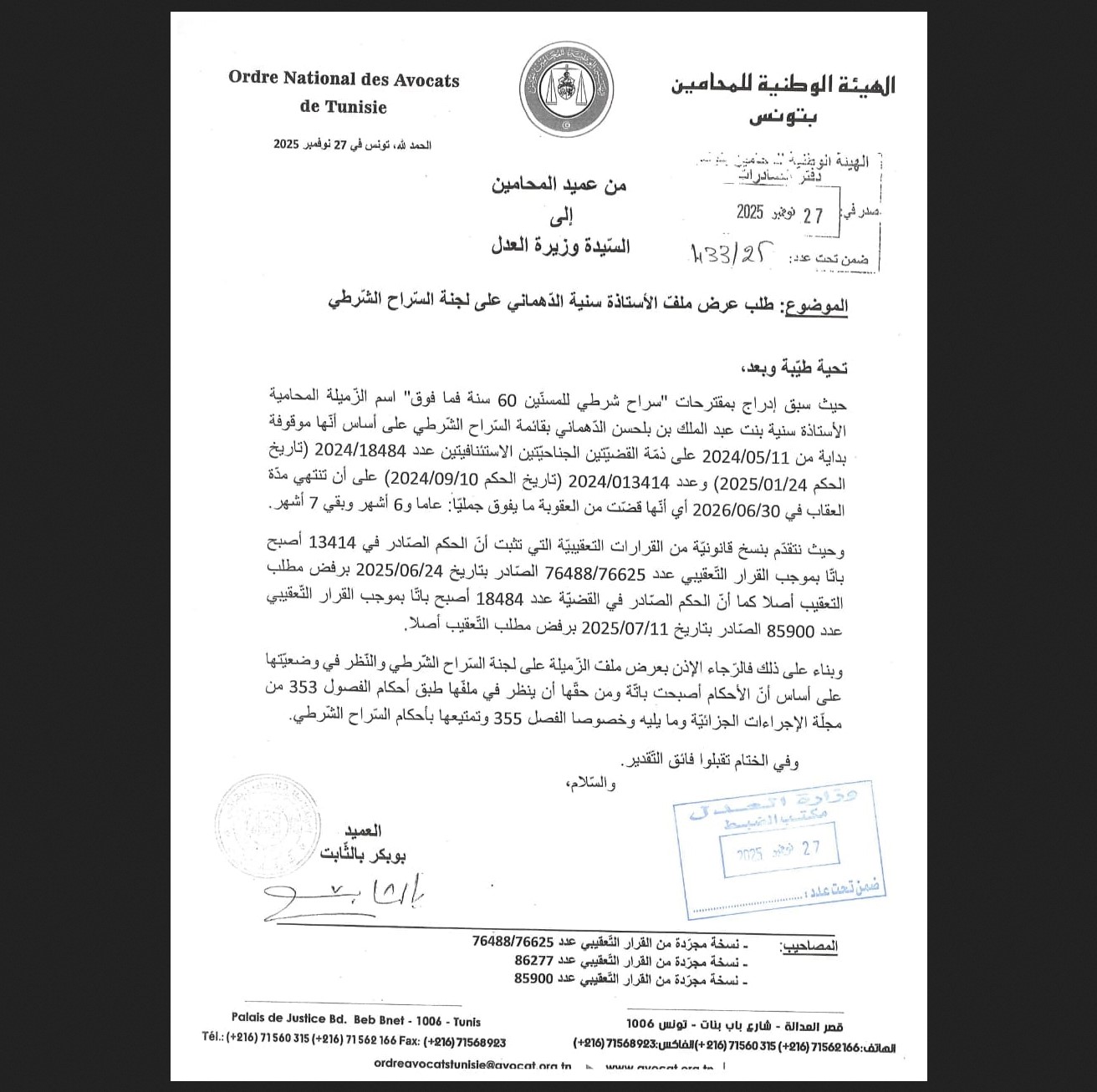 وبالتالي حرّية سنية هي الأمر الطبيعي وليست منّة من أحد، ولكن ما لفت انتباهي هو أمر أخر، اليوم أودعت عمادة المحامين في شخص العميد بوبكر بن ثابت ، مطلبا في عرض سنية الدهماني على لجنة السراح الشرطي مع تقديم مؤيدات مقنعة وقانونية لذلك الطلب، وفي نفس اليوم بل بعد وقت وجيز يصدر قرار من وزيرة العدل يقضي بالسراح الشرطي، في ما يبدو وكأنه استجابة فورية لم نعهدها من قبل! يبدو الأمر غريبا ولا نعلم هل أن قرار الوزيرة كان استجابة أم استباقا؟