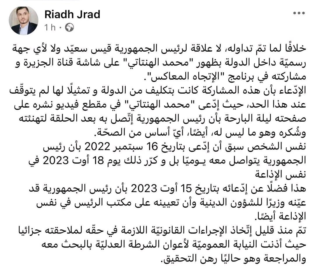 باهي، ومولانا "جراد" أية علاقة إدارية أو صناعية له برئاسة الجمهورية حتى يكذب أو ينفي أية علاقة للهنتاتي برئاسة الجمهورية؟ ولمّا يكذب ادعاء الهنتاتي بأن الرئيس اتصل به بعد حلقة قناة الجزيرة، هل يستند إلى علاقة مهنية برئاسة الجمهورية ملزمة أم شخصية حميمة؟ هل تفتقد رئاسة الجمهورية التي احتاجت 230 مليون دينار من ضرائبنا منها 168.831 مليون دينار للأجور القدرة إلى تأجير مختصين في الإعلام وناطق رسمي باسم رئاسة الجمهورية وعنده فريق من المختصين في الاتصال المؤسساتي مثل كل الدول؟ لا؟ السؤال يقلق؟