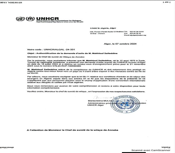 *الصورة من رسالة المفوضية السامية للاجئين التابعة للأمم المتحدة التي توجهت بها السلطات الجزائرية منذ أكتوبر سنة اربع وعشرين وألفين تاريخ انقضاء العقوبة السجنية، والتي تفضلت بنشره زوجته الفاضلة الأستاذة هالة مخلوف المحامية.