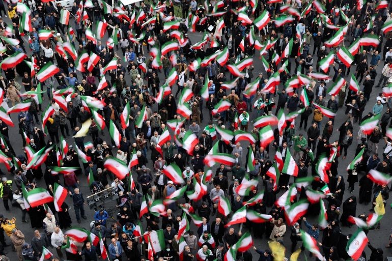 Des manifestants iraniens protestent contre les attaques américano-israéliennes à Téhéran, en Iran [Majid Asgaripour/West Asia News Agency/Reuters]