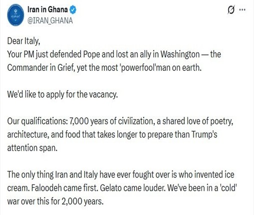 L’Iran continue d’utiliser l’ironie pour s’inviter dans le débat suscité par l’attaque de Donald Trump contre Giorgia Meloni. Après les propos du magnat de l’immobilier — qui avait accusé la Première ministre de ne pas se soucier de la menace nucléaire iranienne — la mission diplomatique de Téhéran au Ghana a lancé une provocation sur les réseaux sociaux, se proposant comme partenaire alternatif aux États Unis.