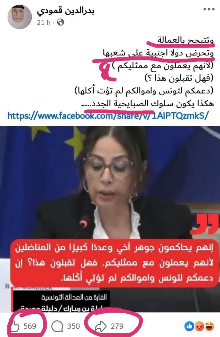 بدر الدين الڤمودي، النائب القيادي في حركة الشعب(مانيش متأكد استقال منها والا لا! والحقيقة لا فرق.. فهو يمثل خيارا قائما يتبناه شق مهم منها) يسبّ في دليلة مصدّق خاطرها تكلمت أمام لجنة حقوق الإنسان في البرلمان الأوروبي.. وبكل بساطة حكم عليها بأنها خاينة للوطن وصبايحية!
