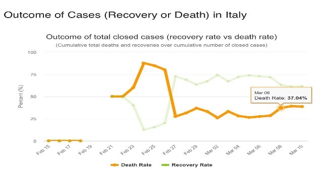 إيطاليا، أيضا تحتسب الوفايات بسبب تعكر الأمراض المزمنة نتيجة للتعفن الفيروسي، وفايات ناتجة عن الإصابة بالفيروس نفسه، عكس فرنسا مثلا. هذا ما يفسّر نسبيا نسبة الوفايات المرتفعة لديها مقارنة ببقية البلدان.